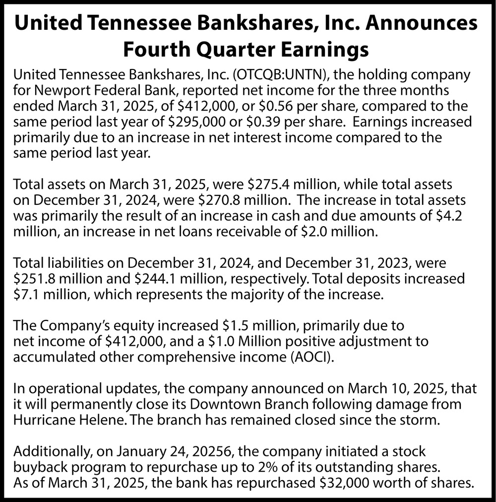 Apr 22, 2025. United Tennessee Bankshares, Inc Public Notice Ads from The Newport Plain Talk