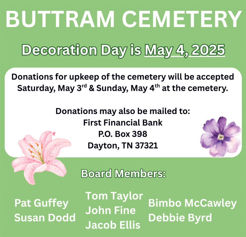 Apr 29, 2025. Buttram Cemetery Funeral Ads from The Rhea Herald-News