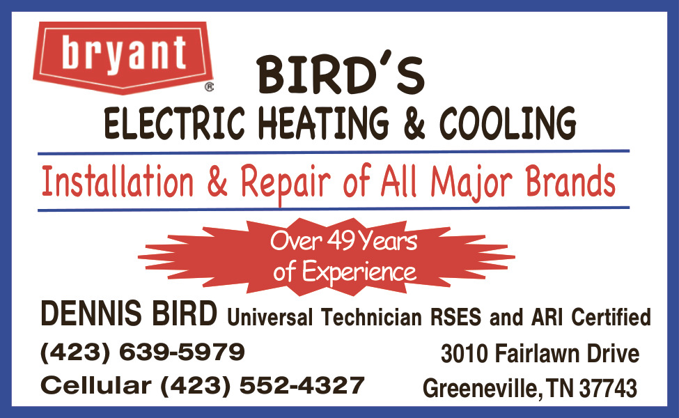 Jul 29, 2025. Bird's Electric Heating & Cooling Heating & Cooling Ads from The Greeneville Sun