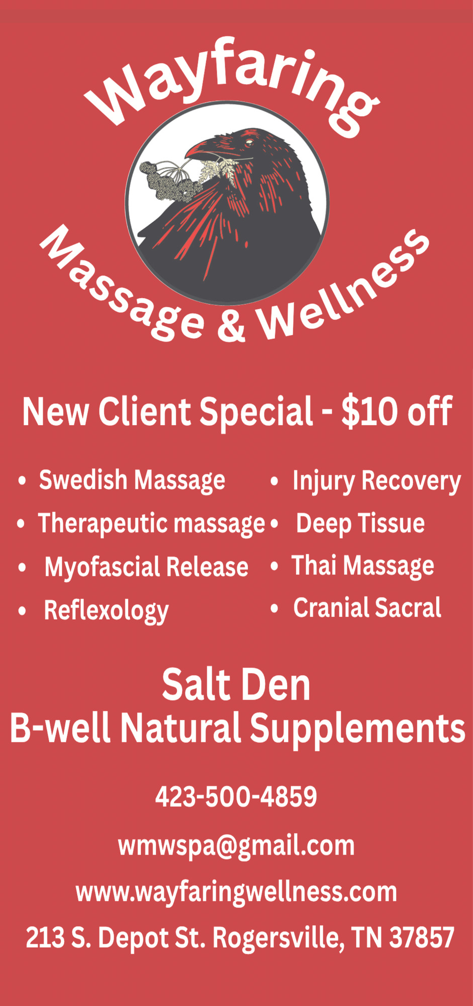 Nov 12, 2025. Wayfaring Massage and Wellness Health & Wellness Ads from The Rogersville Review