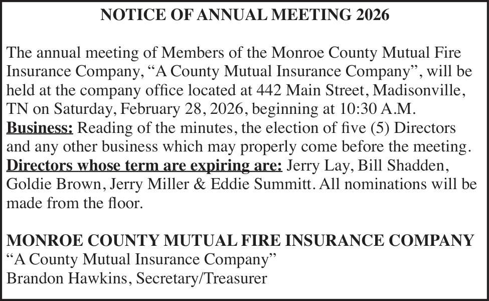 Feb 18, 2026. Monroe County Mutual Fire Insurance Company Public Notice Ads from The Advocate & Democrat