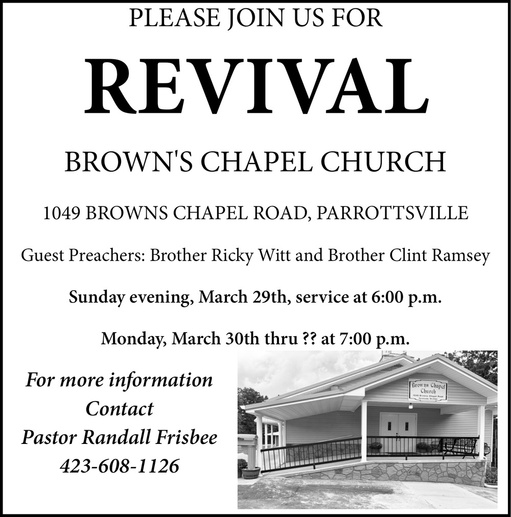 Apr 01, 2026. Brown's Chapel Church Church Ads from The Newport Plain Talk