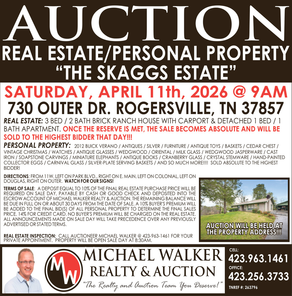 Apr 01, 2026. Micheal Walker Realty & Auction Real Estate Ads from The Rogersville Review