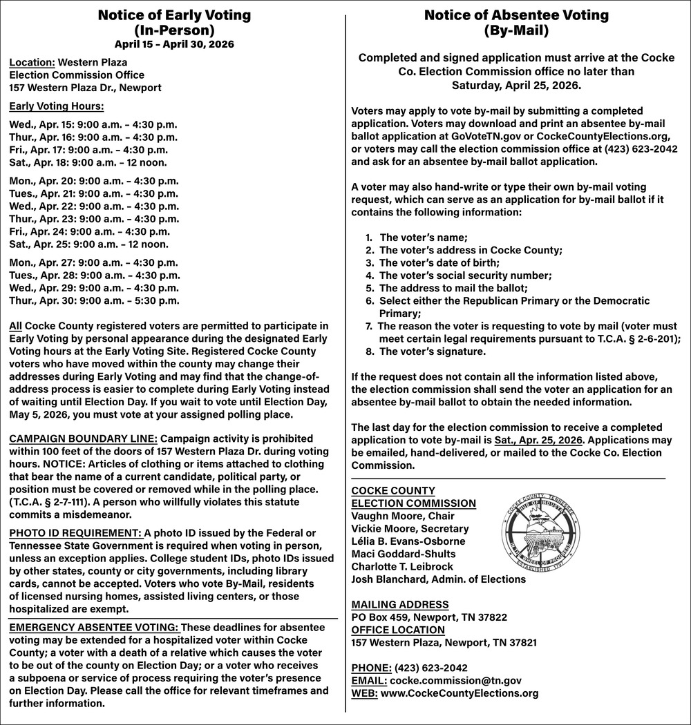 Apr 08, 2026. Cocke County Election Commission Government Ads from The Newport Plain Talk